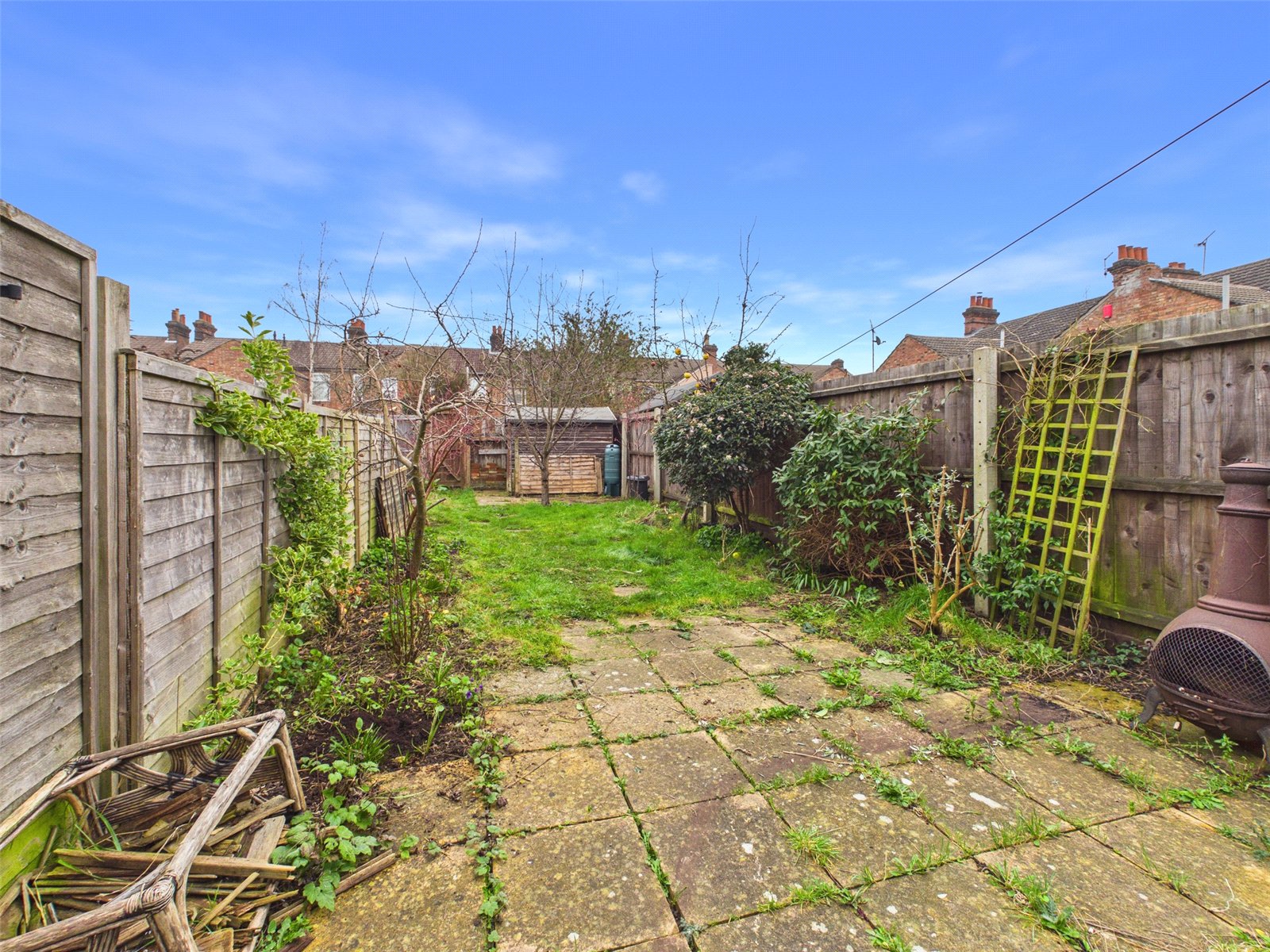 Rear Garden with Patio area and lawned garden. Garden Shed.