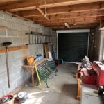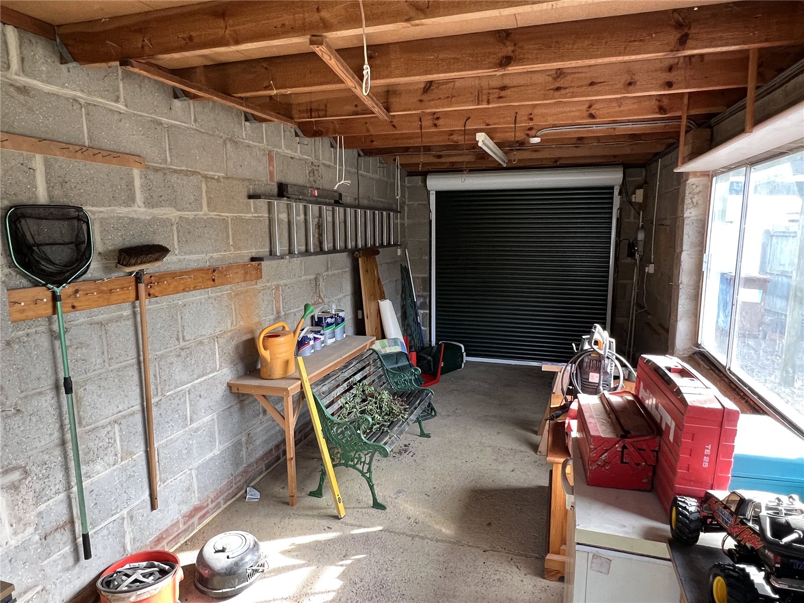 Rear garden: Side gate to rear garden with small decked area and lawned area with koi carp pond with pump and water feature. Garage with work bench and power with electric roller blind garage door.