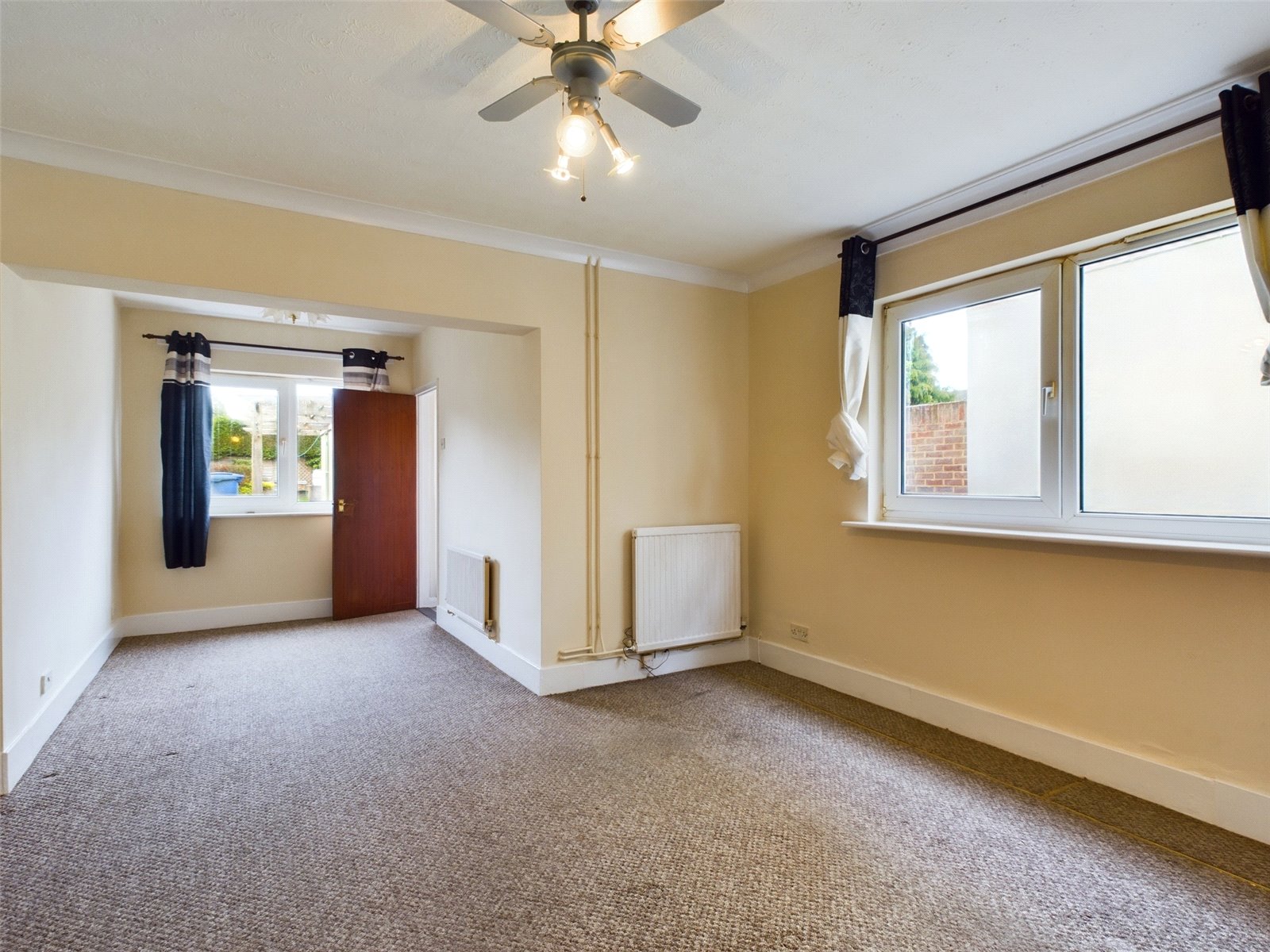 Front Room: 3.46m x 3.30m ( 11'4" x 10'9") Double glazed windows to front, power points, recess cupboard with access to meters and fuse board. radiator, Two uplighters to recess. Door into: